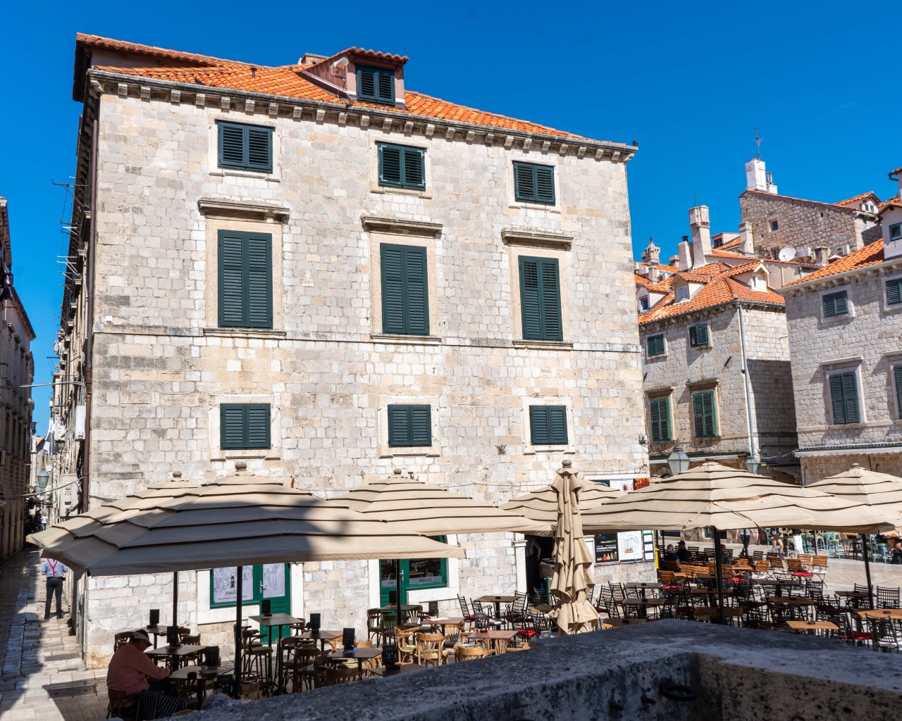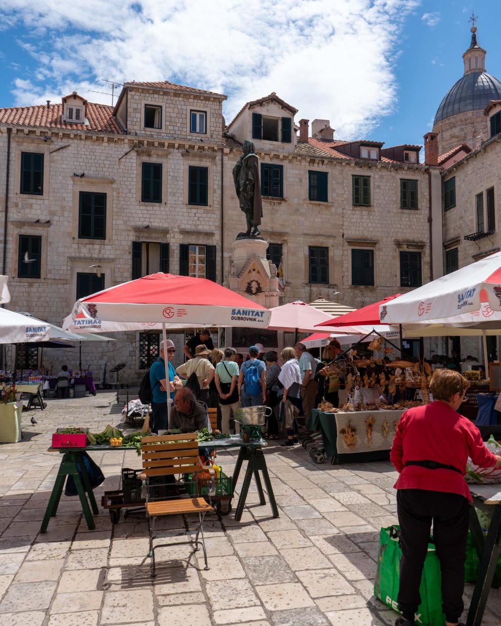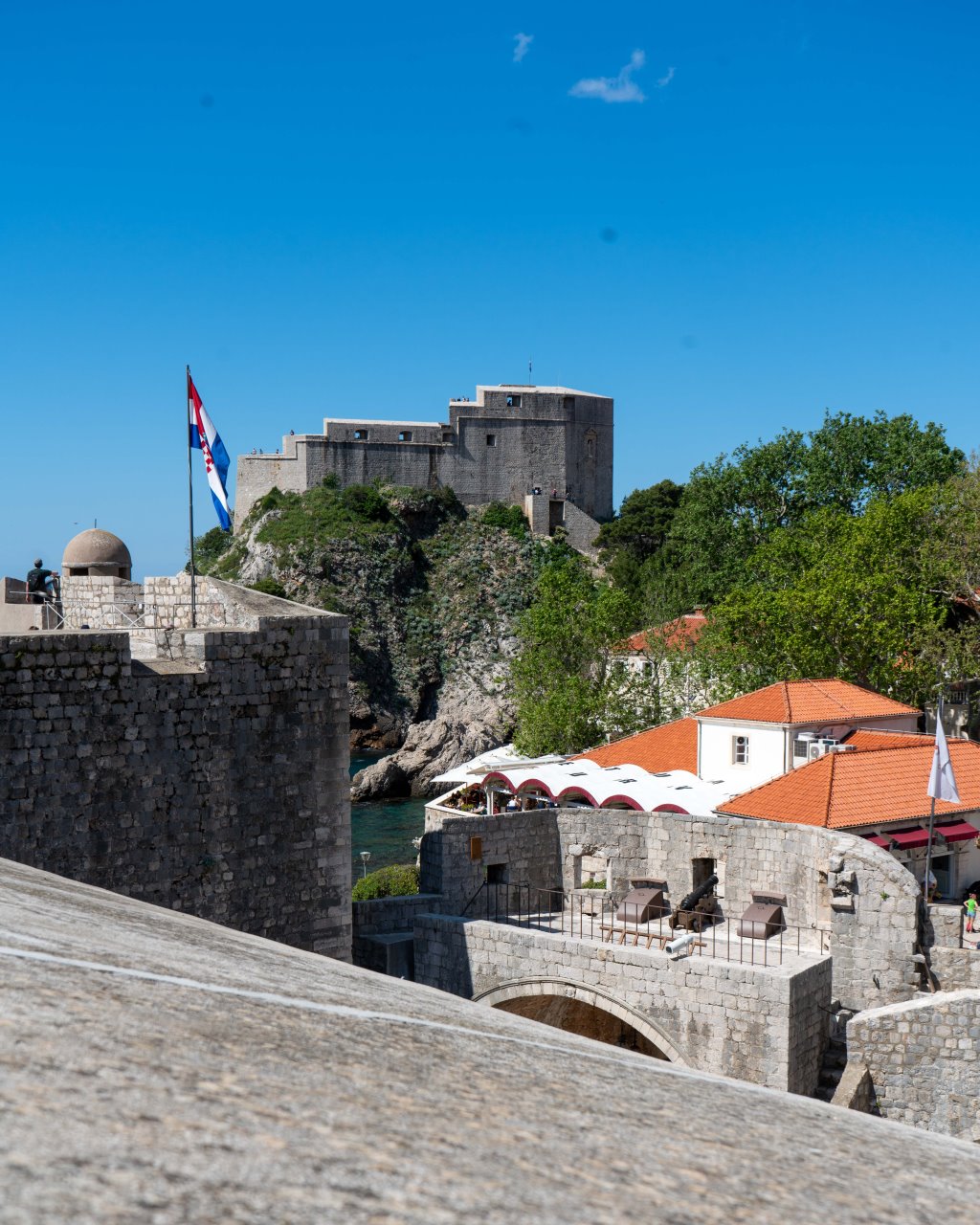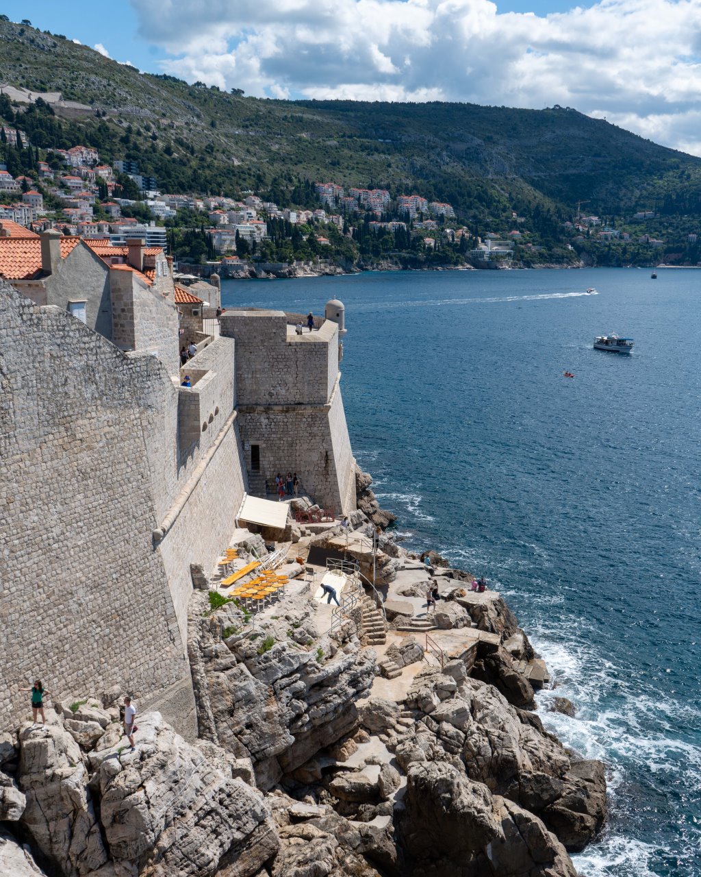 Die Wahl des Campingplatzes fiel daher auf „Camping Kate“ in Mlini, nur wenige Kilometer südlich. Nicht nur dass er günstig ist (14 EUR ohne Strom), Mlini verfügt auch über eine sehr hübsche Promenade, Strand, mindestens ein sehr gutes Fischlokal unter Pinien („Puntizela“), in dem ich heute geruhte zu speisen. Nein, mit einem Wassertaxi ging’s problemlos direkt zum Stadtportal der Altstadt ( 30 Min. direkt, 15 EUR/Person hin und zurück) – relaxed.